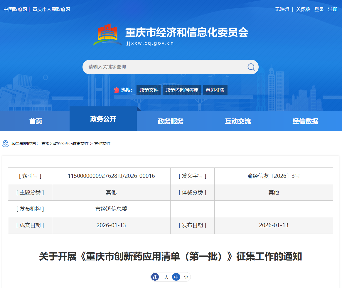 近日,重庆市经济信息委联合市卫生健康委、市医保局、市药监局,印发《关于开展〈重庆市创新药应用清单(第一批)〉征集工作的通知》,面向符合条件的创新药产品开展集中征集。业内认为,这一举措释放出重庆创新药政策进一步向应用端延伸的明确信号。