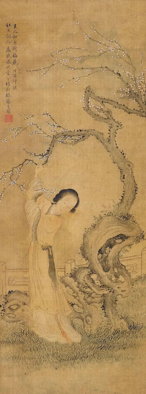 更绝的是,余集的仕女画里藏着“空间魔术”。《梅下赏月图》中融金汇银,一株老梅斜斜探入画面,枝干虬曲如龙,却偏偏在枝头留出半轮明月。仕女仰头望月,衣袂被风吹得微微扬起,仿佛下一秒就要乘风归去。这哪里是画人?分明是在画“仙气”!难怪时人夸他“风神闲静,无脂粉气”,这哪是凡人,分明是画里的洛神!