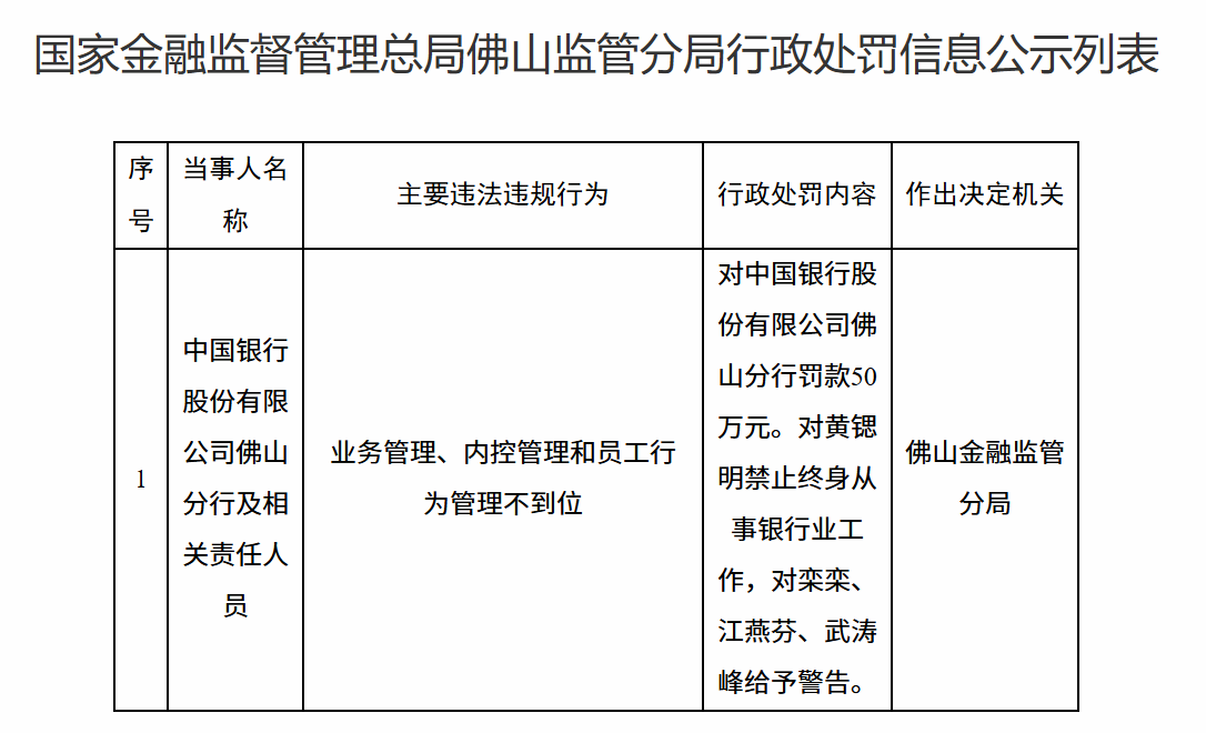 1月6日,国家金融监督管理总局佛山监管分局行政处罚信息公示列表显示,中国银行股份有限公司佛山分行及相关责任人员因业务管理、内控管理和员工行为管理不到位被罚款50万元。黄某明被禁止终身从事银行业工作,栾某、江某芬、武某峰被警告。