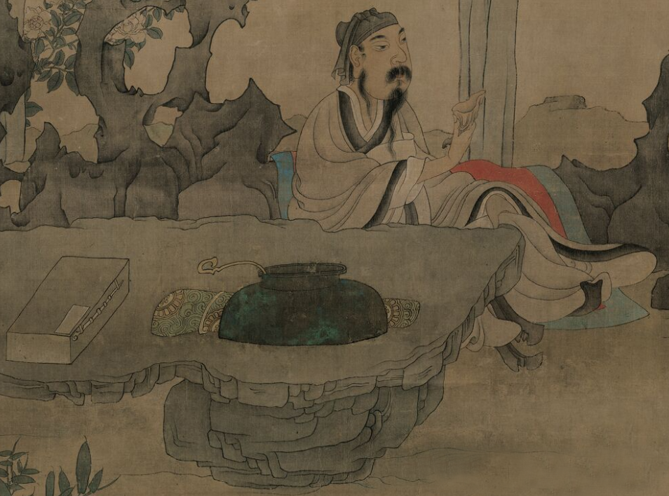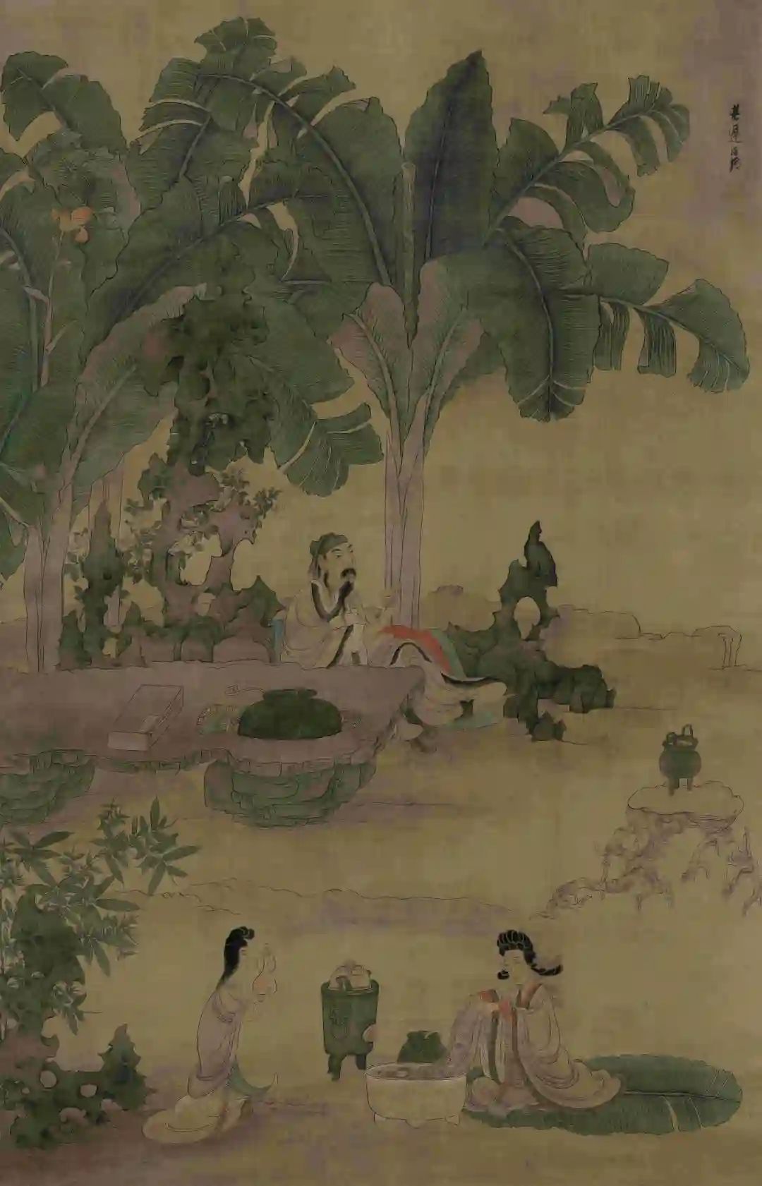 背景的蕉林和湖石更是“摆烂”氛围组。三株芭蕉高耸入云,叶片大得能当遮阳伞,把主角裹得严严实实,仿佛在说:“别卷了,世界与我无关。”湖石玲珑剔透,却歪歪扭扭地杵在角落,像极了当代年轻人“能躺绝不坐”的佛系心态。更绝的是,画面里的鼎、壶、琴、书全是古物,但主角偏不弹琴不读书,只顾喝酒,活脱脱“买椟还珠”的现代版。