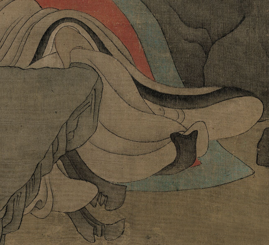 画中主角的姿势堪称“摆烂”教科书:右手举爵,左手撑案,跷着腿,眼神放空,仿佛在说:“卷不动了,毁灭吧。”这哪是高士?分明是社畜穿越回明代提前退休!陈洪绶用细劲如刀的线条勾勒出主角的衣褶,却偏让他瘫成一团软泥,这种“反差萌”让人忍俊不禁——原来古人也懂“躺平才是终极奥义”。